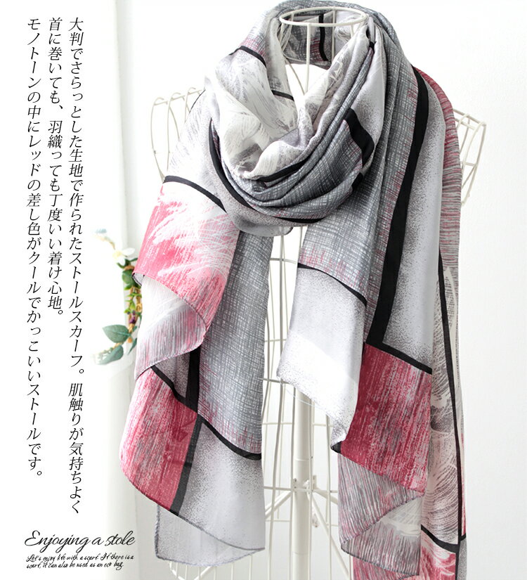 モノトーンの中にレッドの差し色がクールでかっこいいストールです。