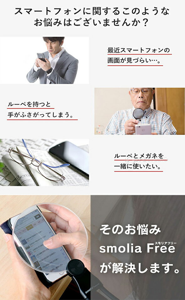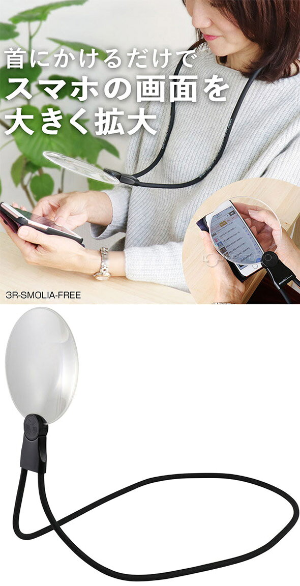 ルーペ 携帯 スマホ おしゃれ 1.7倍 読書 ネイル 老眼 拡大鏡 虫眼鏡 ストラップルーペ 首掛け 首にかける スマホスタンド 3R-SMOLIA-FREE-H スモリアフリー 手芸 マスク 糸通し商品番号:3R-158大人気の首掛け拡大鏡smolia-free(スモリアフリー)に取り付け可能な「スマホホルダ」がセットになった商品です。